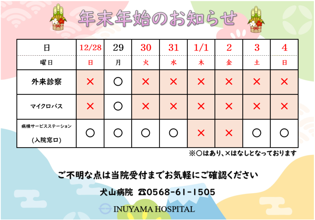 年末年始は令和7年12月30日(火)~令和8年1月4日(日)までの期間が休診日となります。大変ご不便をおかけしますが、よろしくお願いいたします。